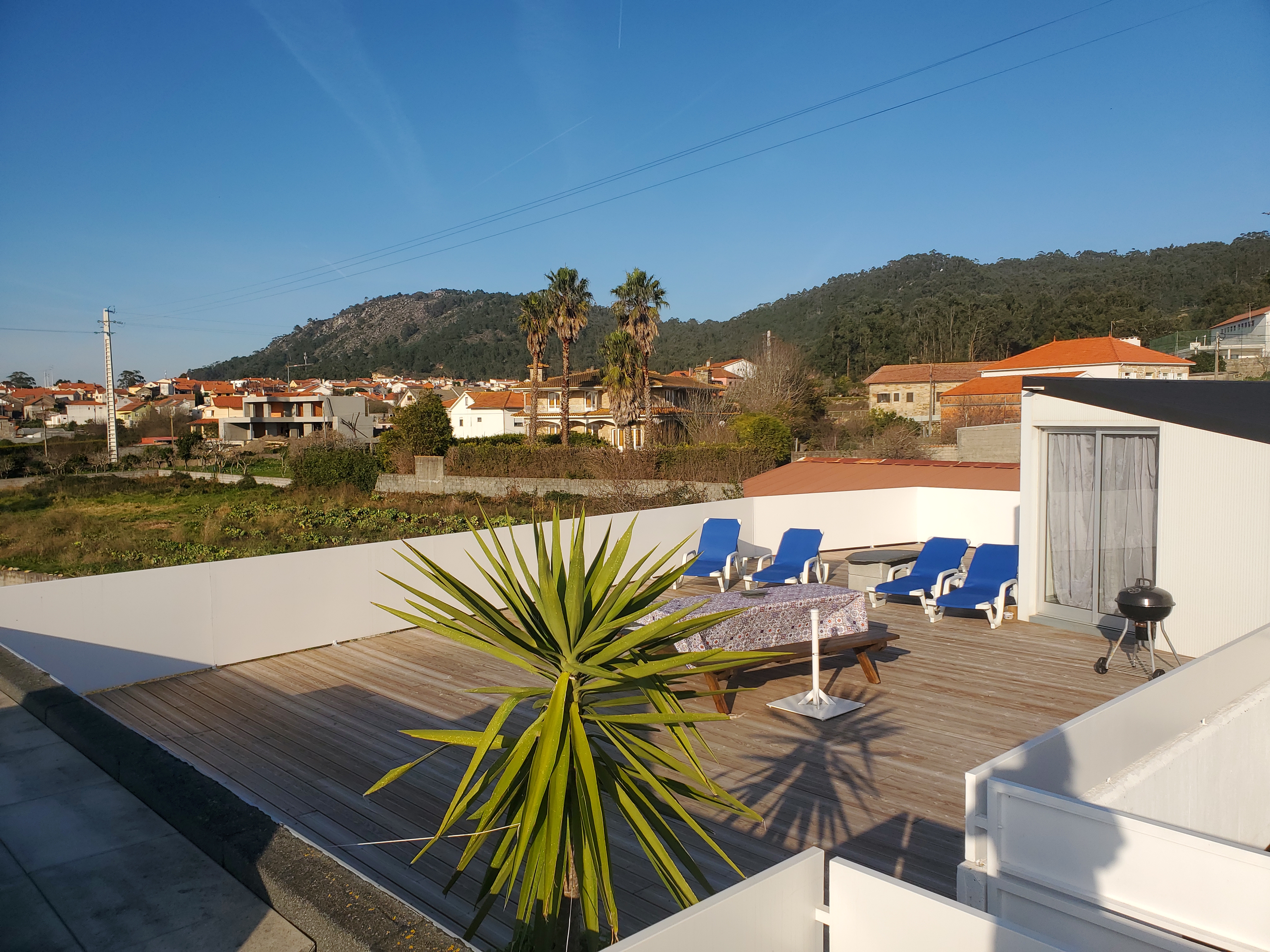 Terrasse privée sans vis à vis de 100m2 avec vue sur océan, salon de jardin, barbecue, chaises longues.
